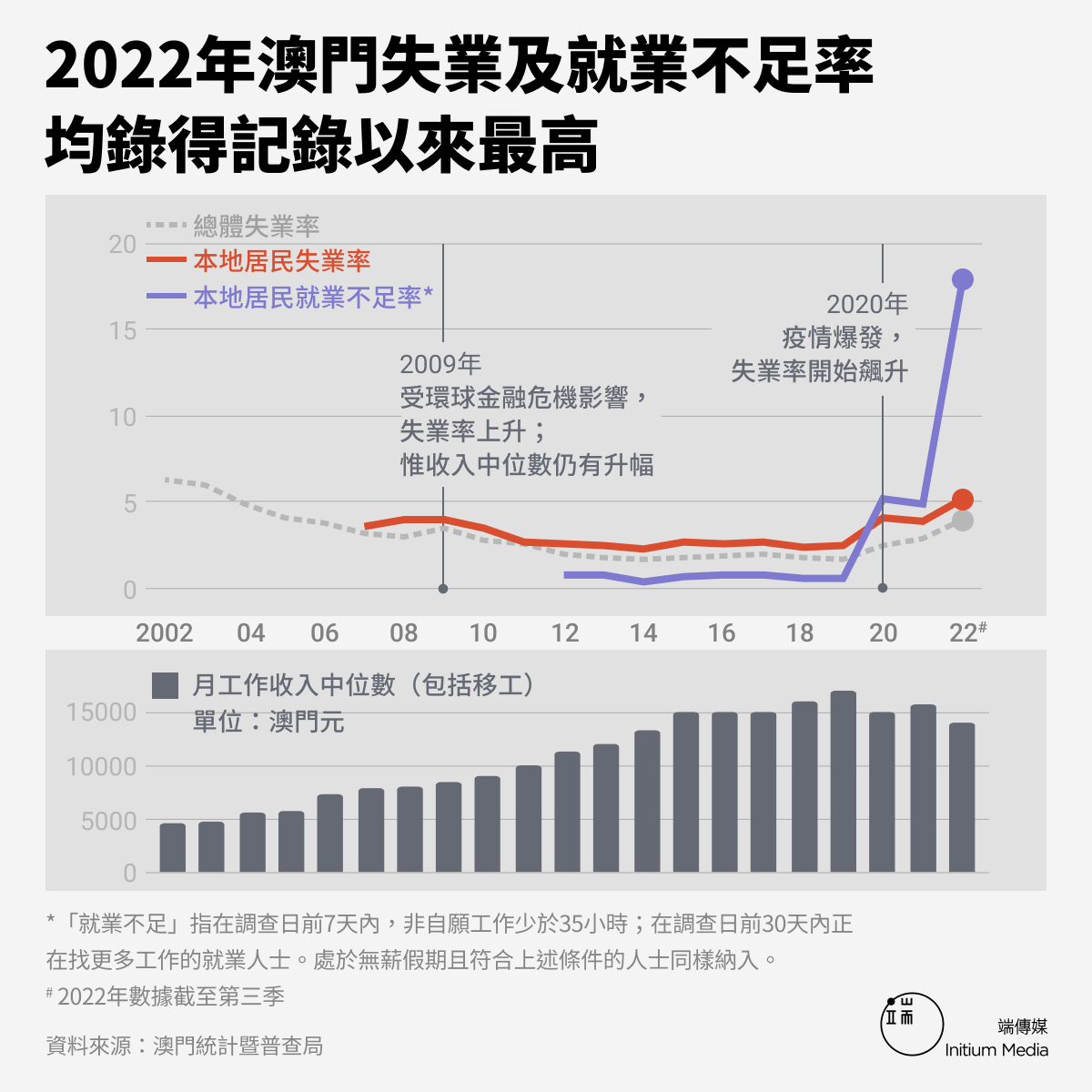 所謂就業不足,指在調查日前7天內,非自願地工作少於35小時。據澳門統計暨普查局統計,自2012年有記錄以來,本地居民就業不足率幾乎徘徊在0.8%到0.6%之間,後在2020年疫情時升到了5.2%。然而嚇人的是,截止2022年第三季,即經歷過相對靜止階段之後,瞬間就飛升到了17.9%——人數達到5萬人,佔整體勞動居民的1/5。
