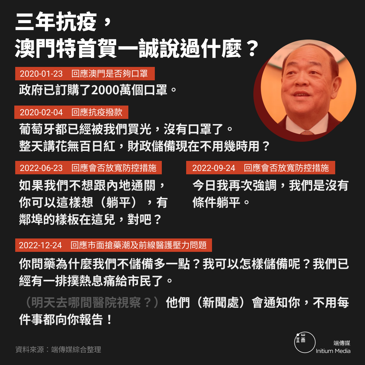 2022年9月24日,賀一誠在回應記者提問會否放寬防控措施時表示,「我再次強調,我們是沒有條件躺平」,結果只消兩個月,澳門人便要在開放中摸爬、自救。