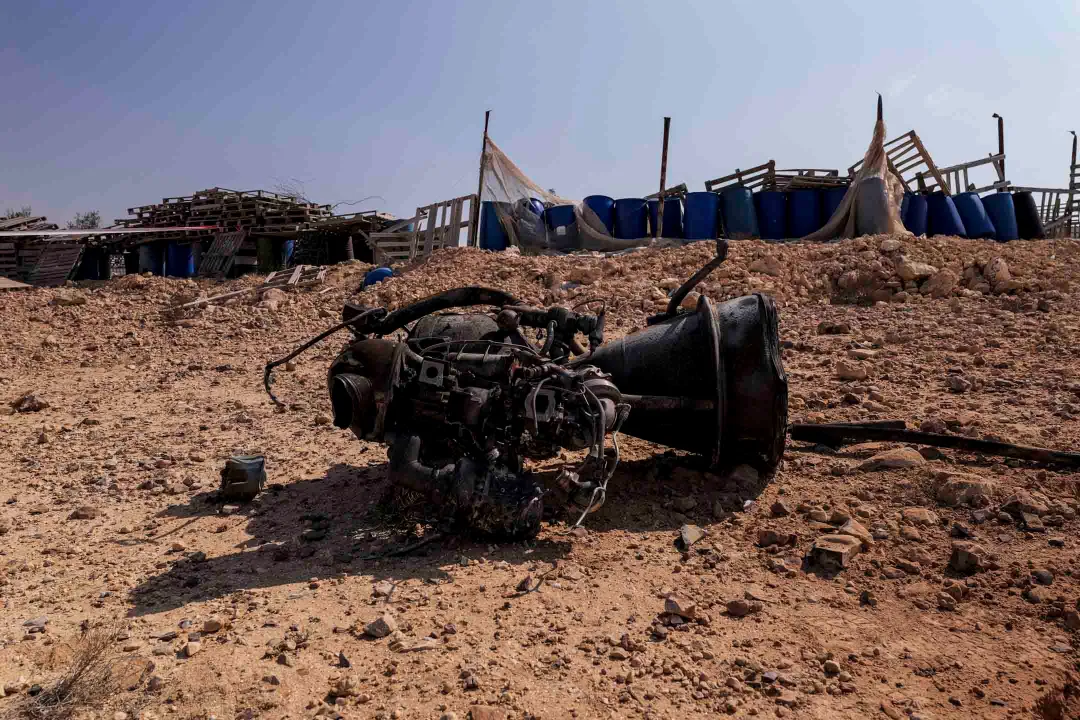 2024年4月14日,据以色列当局称,在以色列阿拉德附近,伊朗向以色列发射无人机和飞弹后,火箭助推器的残骸导致一名 7 岁女孩受重伤。摄:Christophe van der Perre/Reuters/达志影像