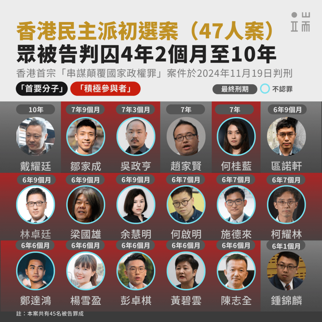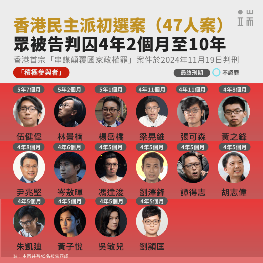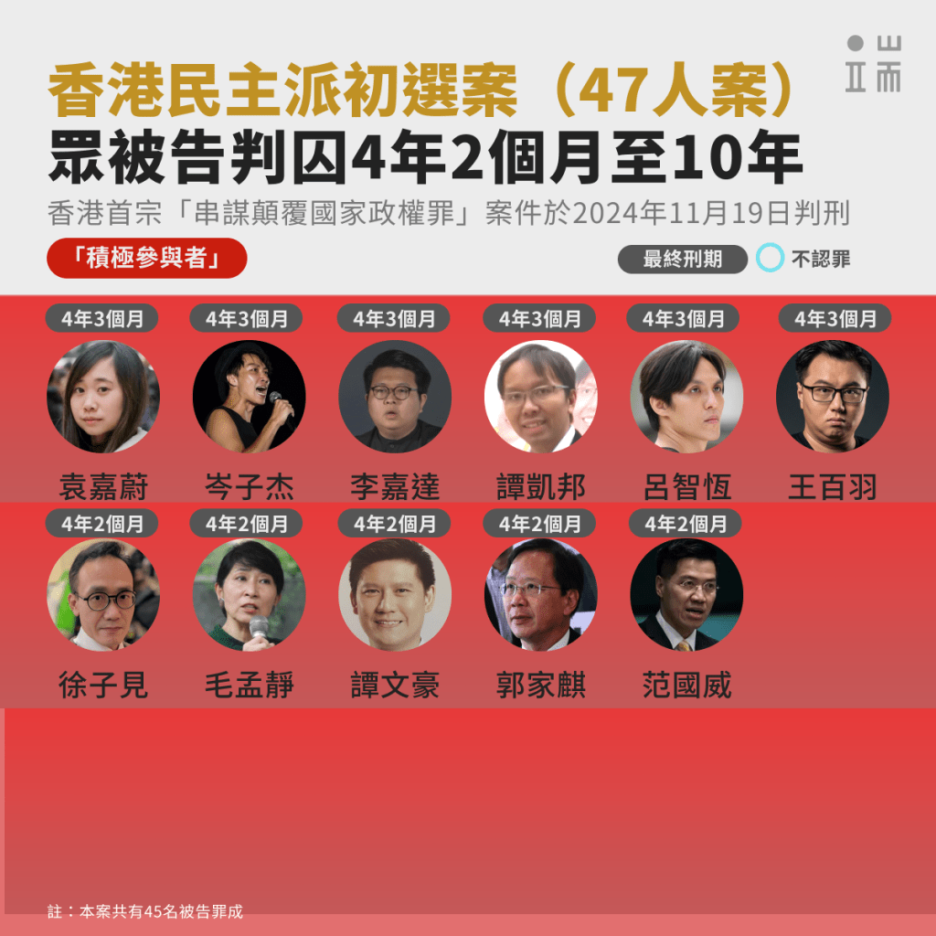2024年11月19日,香港高等法院原訟庭三名國安法指定法官,就2020年民主派初選案,對45名「串謀顛覆國家政權」罪成被告作出判刑。眾被告判囚10年至4年2個月不等。