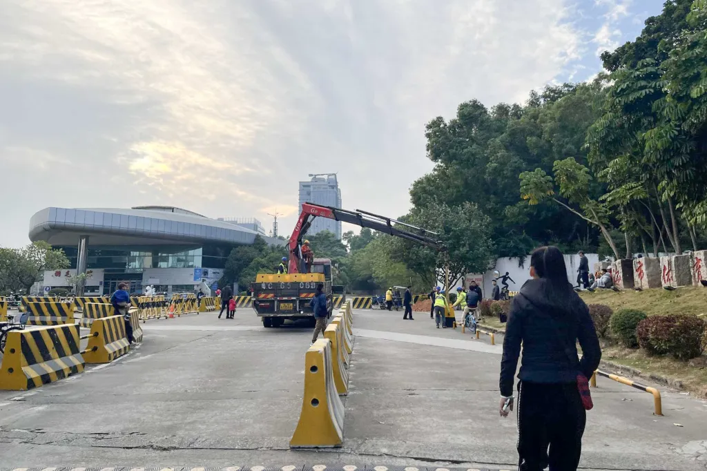 在珠海市體育中心前,石墩則更為密集。12月中旬的一個週六下午,體育中心大多數場館和店鋪大門緊閉。十幾個工作人員正在指揮起重機吊起隔離墩、碼成一列新的路障。發生撞人事件的環道已被密密的隔離墩「切割」成很多段。兩個藍頂的臨時帳篷支在路障內,路障後還有一名警察、兩名保安。偶爾有路人經過,在路障前好奇地伸長脖子張望——儘管這段被隔離出來的環道上如今什麼也沒有。