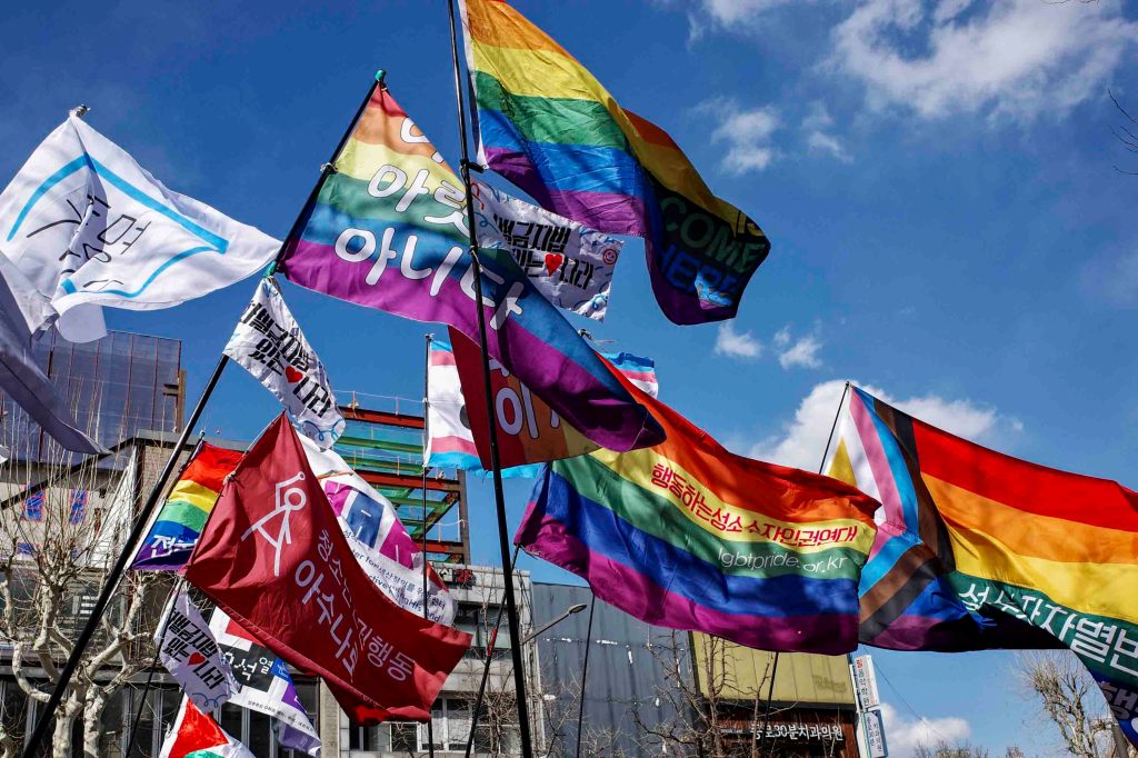 穿过人群,在广场的后方,集合著过百张抗议旗。这些旗子大多由个人带来,有猫猫旗、“国际独角兽保护协会韩国分部”、“鬼杀队”、“全国公主协会”、“贫穷艺术家协会龙山分部”、“写论文时离家出走的人”、“华山剑派”……还有遍布各个角落的彩虹旗、跨性别丝带。
