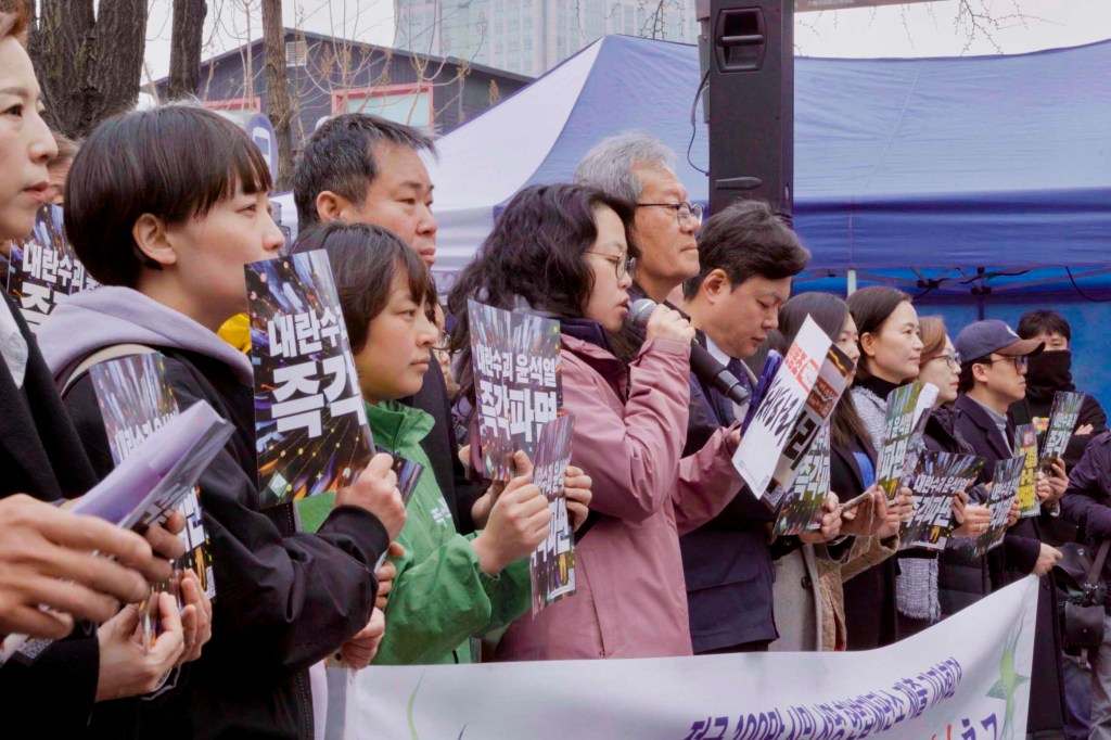 在1月5日的守夜活动上,“集会示威人权监察小组”的代表、律师朴韩熙(박한희)登上讲台。
