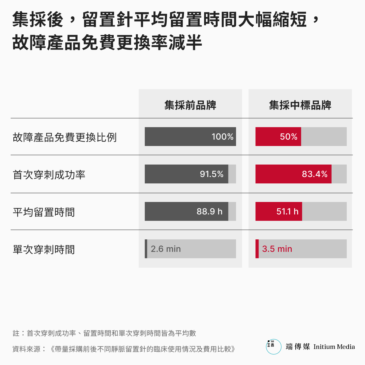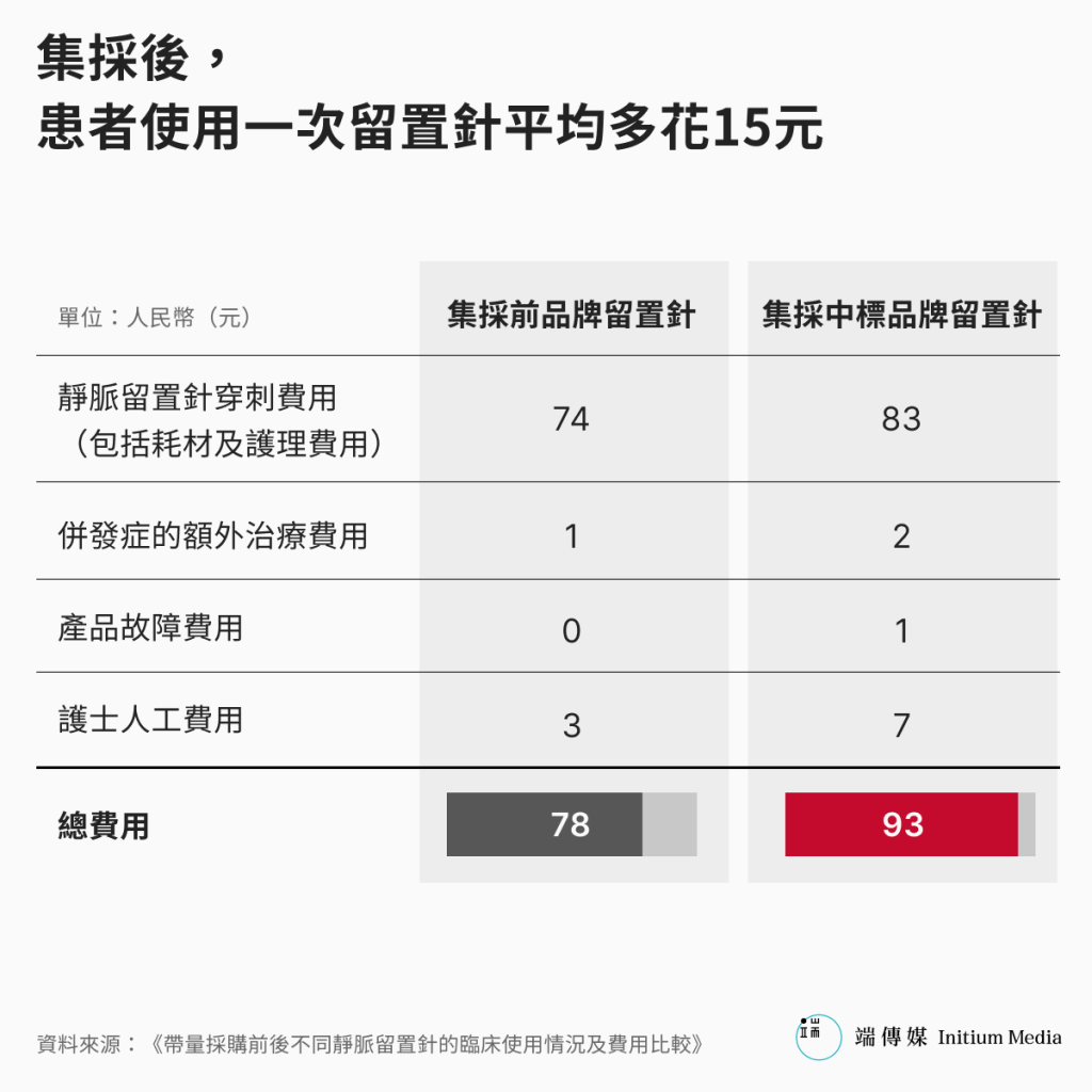 復旦大學公共衛生學院於2020年3月至4月,對江蘇省南京市和山東省臨沂市16家醫院的27位臨床護士進行訪談,將集採後使用的中標品牌留置針與之前的產品進行對比,建立模型計算兩者的整體費用。
