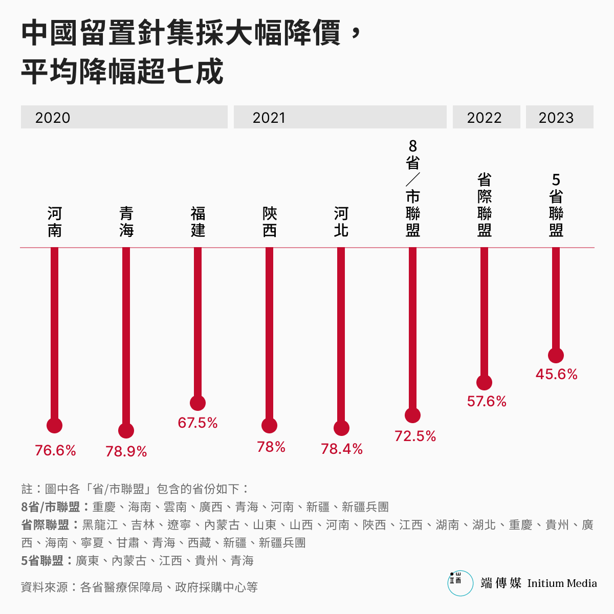 端傳媒整理2020至2023年中國各省醫保局對留置針集採的公示發現,前幾批的省級採購中,留置針的平均降價幅度大多超過七成,最高降價幅度甚至超過94%。中選名單中,最便宜的留置針價格不到1.5元。
