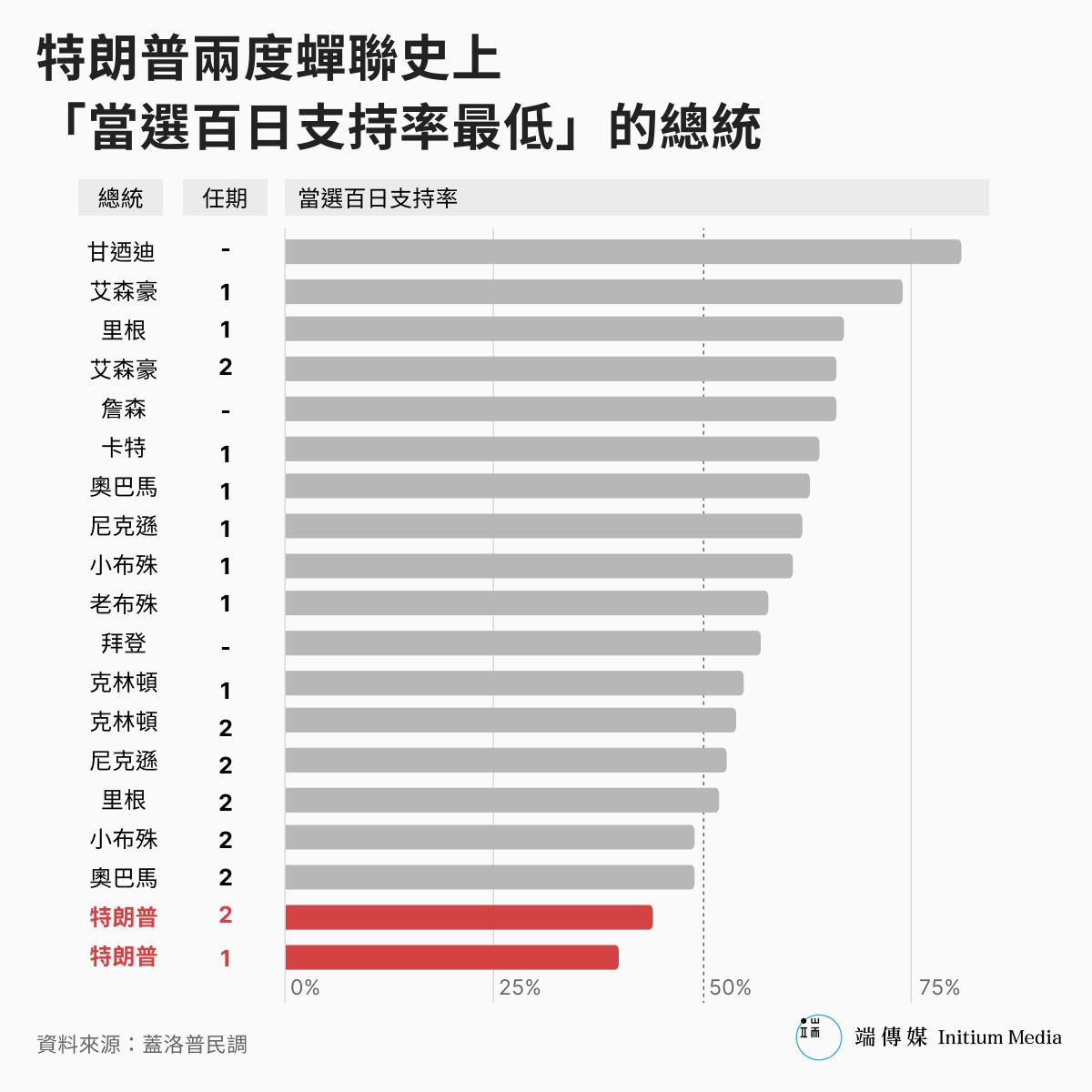 同樣以蓋洛普這個歷史悠久的民調機構為依據,特朗普在第二任期蟬聯美國戰後有民調紀錄以來「上任百日時支持率最低」的總統,兩個任期的百日支持率分居史上最差和次差。