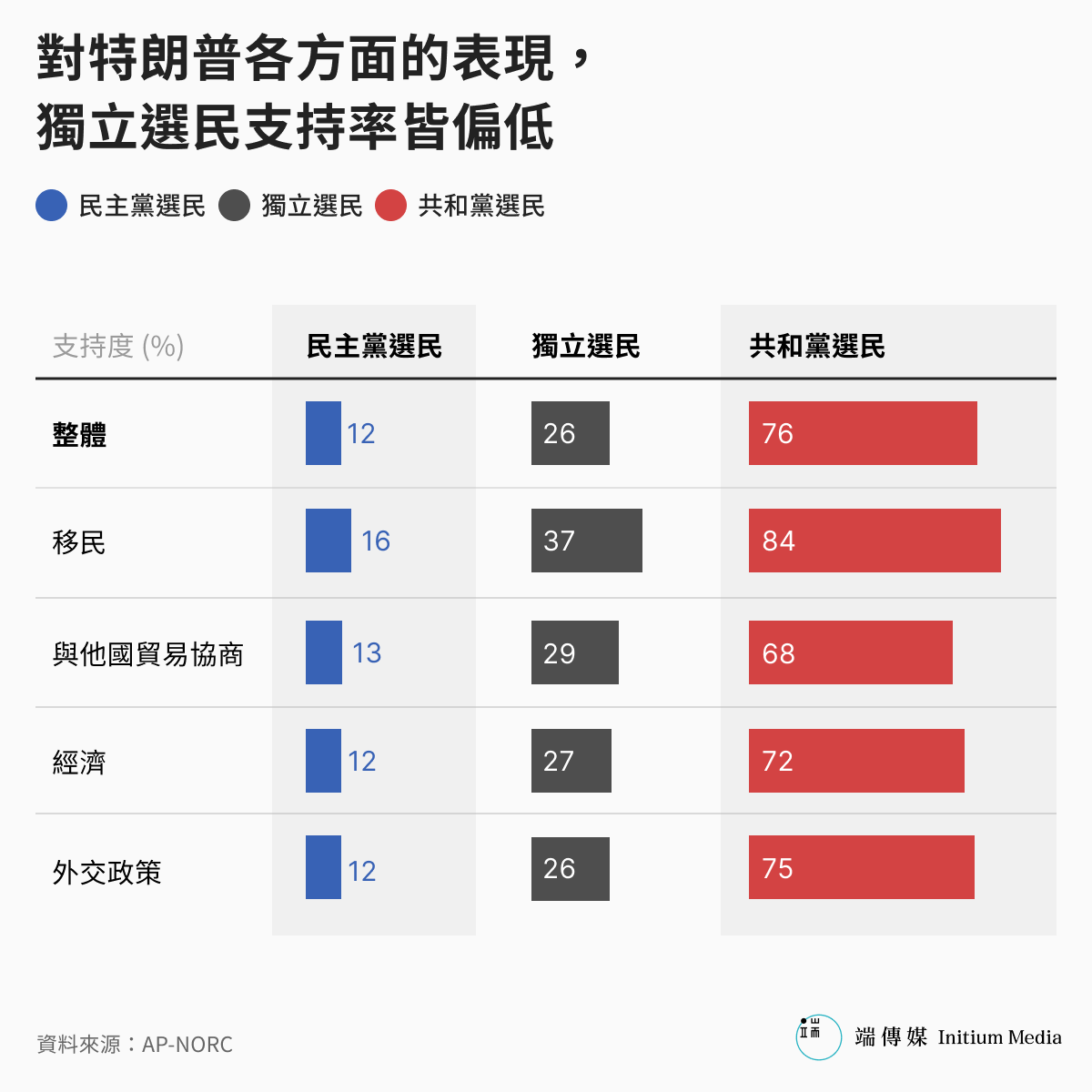 在經濟、移民、貿易協商、外交政策等各個層面,民主黨選民對特朗普百日的表現支持率都將極低。若以AP-NORC的民調為資料來源,可以看見民主黨選民對特朗普政府各面向的支持率都在15%的低檔徘徊,在民調上近乎探底。同時共和黨選民普遍認可特朗普政府的表現:民調顯示,其整體支持率來到76%、四分之三的高標,在移民這項指標性議題上更高達84%,就連目前較不明朗的「與他國貿易協商」也都有68%。在壁壘分明的美國,這樣的結果合乎一般預期。