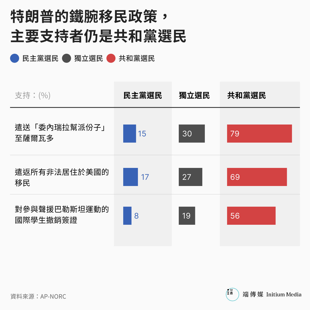 AP-NORC的民調同樣調查了特朗普新政府三大指標性的移民鐵腕政策,其中,遣送「委內瑞拉幫派份子」至薩爾瓦多監獄此一議題,涉及傳統的治安考量,理論上應是最為討好的政策,但現實上,即使有治安面向的加成,獨立選民也只有30%支持此一政策,雖高於民主黨選民中的15%,但仍是屬於少數,更明顯低於共和黨支持者高達75%的全力相挺。