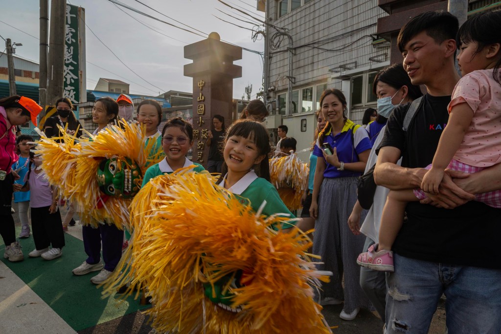 2025年5月6日,南投,一间学校的学生知道白沙屯妈视将途经学校,在外跳舞迎接。摄:陈焯煇/端传媒