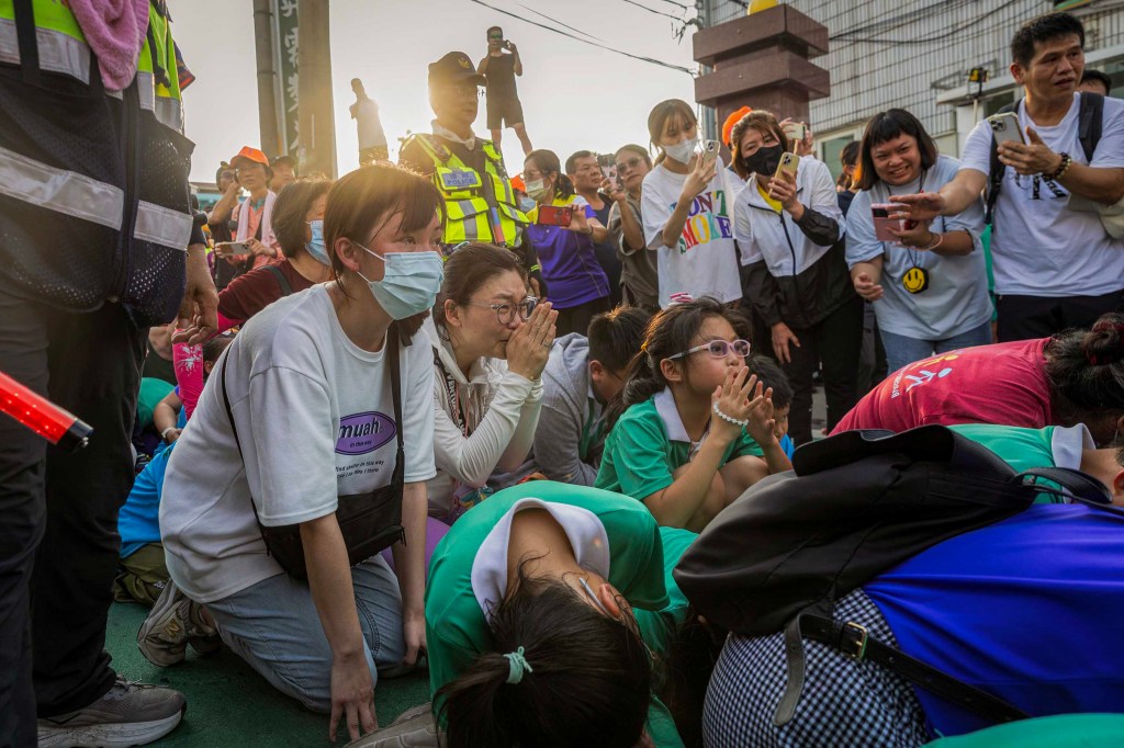 2025年5月6日,南投,白沙屯妈祖途经一所学校,学生和信众排队预备躜轿脚。摄:陈焯煇/端传媒
