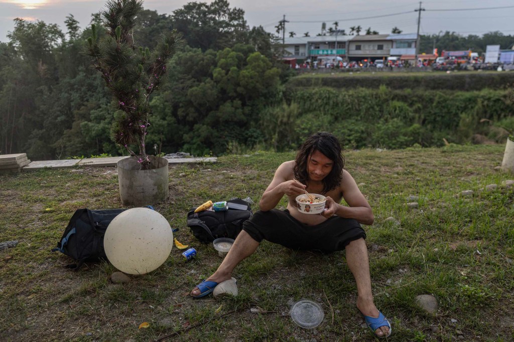 2025年5月6日,南投,香灯脚在享用晚餐,预备休息。摄:陈焯煇/端传媒