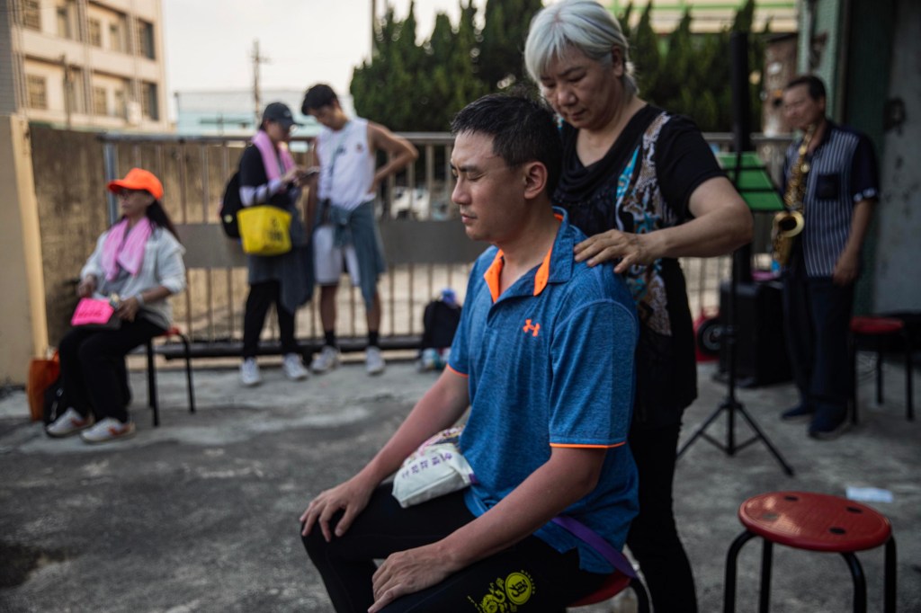 2025年5月2日,彰化,旅途上的香灯脚坐下,有居民替他按摩。摄:陈焯煇/端传媒