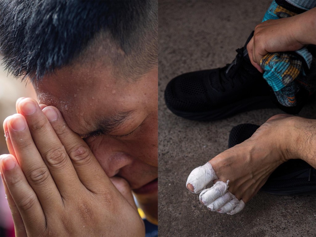 (左)2025年5月6日,南投,白沙屯妈祖200多年来首次驻驾南投县,信众诚心参拜。(右)2025年5月2日,彰化,香灯脚重新穿上波鞋,预备上路。摄:陈焯煇/端传媒
