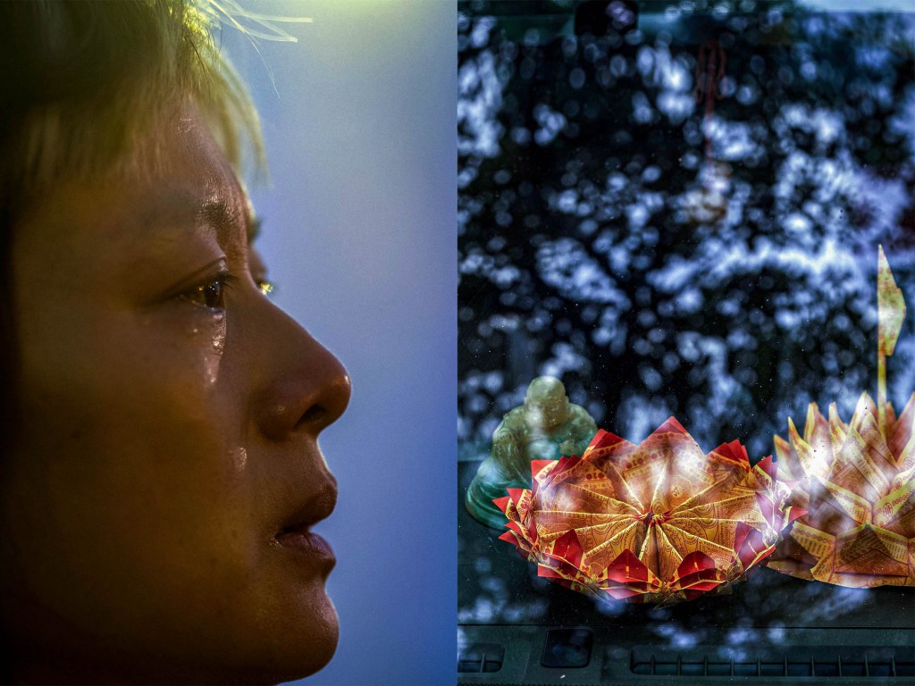 (左)2025年5月6日,南投,信众在妈祖驻驾的地方流泪。(右)2025年5月6日,南投,一架汽车内放著信众的金纸莲花。摄:陈焯煇/端传媒