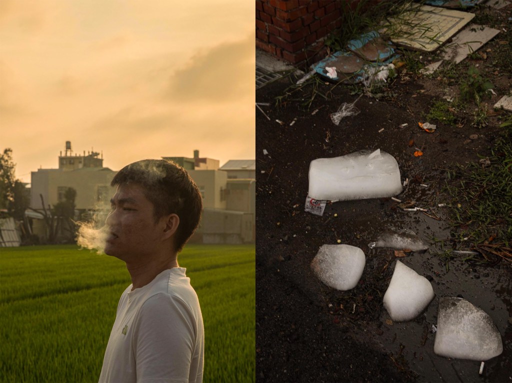 (左)2025年5月2日,彰化,信众在路旁抽烟。(右)2025年5月2日,彰化,路上的冰块。摄:陈焯煇/端传媒