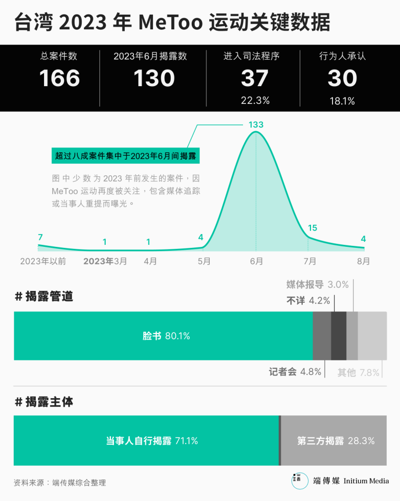 端传媒所整理的166起性骚及性侵指控名单,超过八成案件集中于2023年6月间揭露,受害时间则从数个月前至数年前不等,显示受害者的创伤并未随时间淡化,而是等待适当的发声时机。此外,有别于过去受害者控诉名人时,多透过政治人物或新闻媒体发声,MeToo运动中有高达七成事件由当事人自行透过脸书揭露,或是由亲友透过脸书公开,突显受害者在此次运动中主动掌握话语及叙事权的企图。