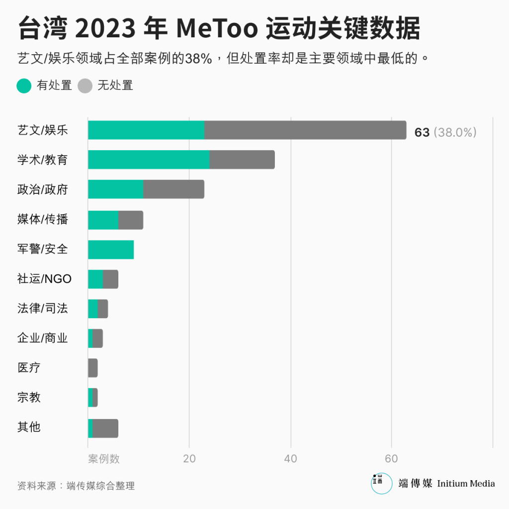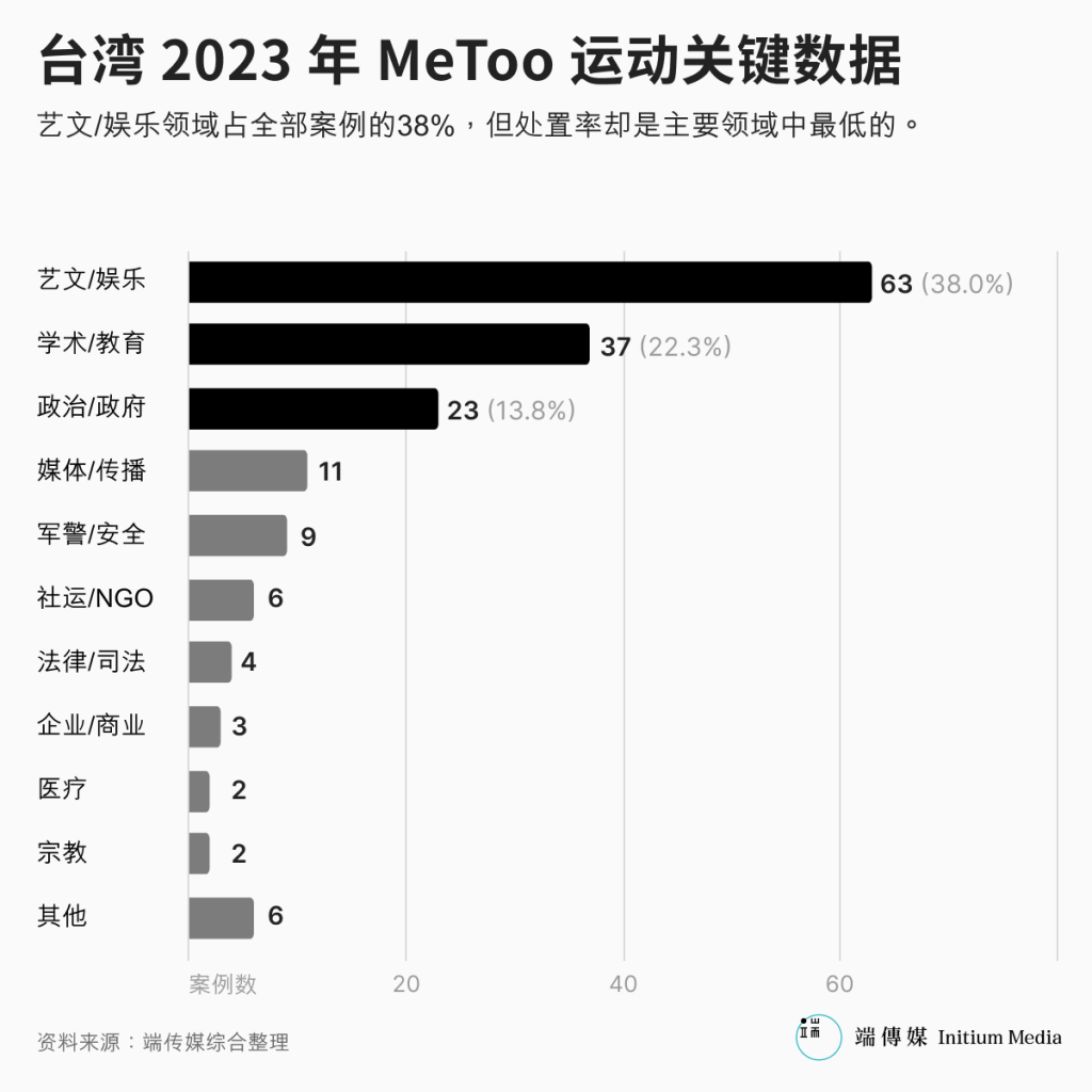 综观不同领域中,艺文及娱乐圈是MeToo事件的“重灾区”,2023年6至8月间共爆出63起指控,居所有领域之冠,其中多起事件因加害者为知名人士,成为公众焦点。