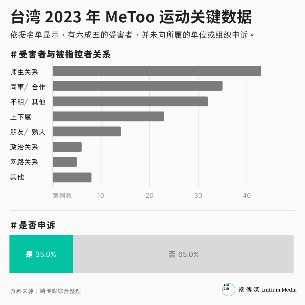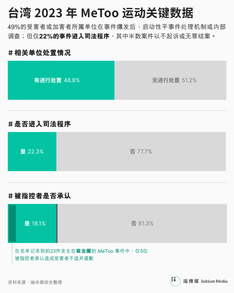 2023年的这场MeToo运动铺天盖地,相关指控及案件追踪难以穷尽,这份名单虽非全面亦难完整,但我们仍试图从这份名单出发,追踪几桩代表性事件的后续发展,进而分析事件经内部调查或司法审判的比例,探究台湾社会经历MeToo运动后,发生哪些变化。