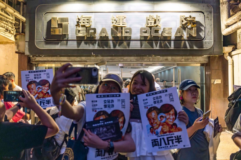 2025年6月1日,尖沙咀海运戏院最后一天营业特别举办三场告别盲盒场,第一场《半斤八两》放映完结后,观众与电影海报及戏院招牌合照。摄:邓家烜/端传媒
