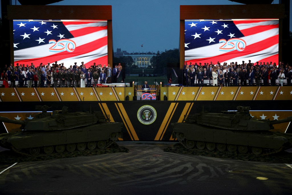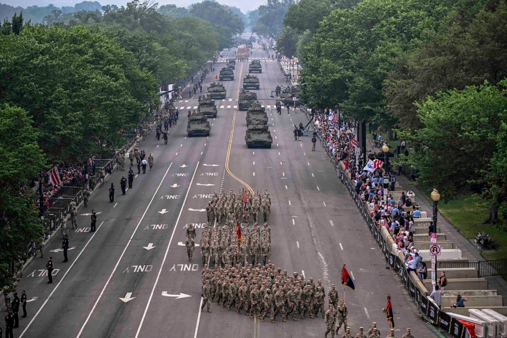 這場遊行有6000多名士兵和128輛陸軍坦克參加。閱兵式持續一個半小時,隨後舉行音樂會與煙火秀,美國陸軍估計花費在2500萬至4500萬美元之間——這樣的大規模慶祝,是特朗普上任後的新增內容。