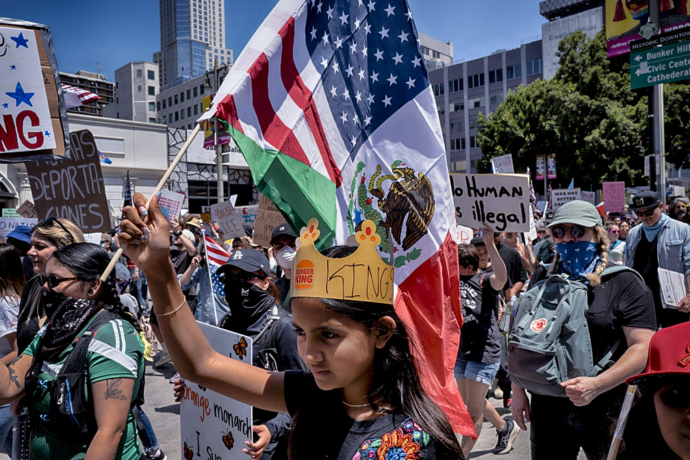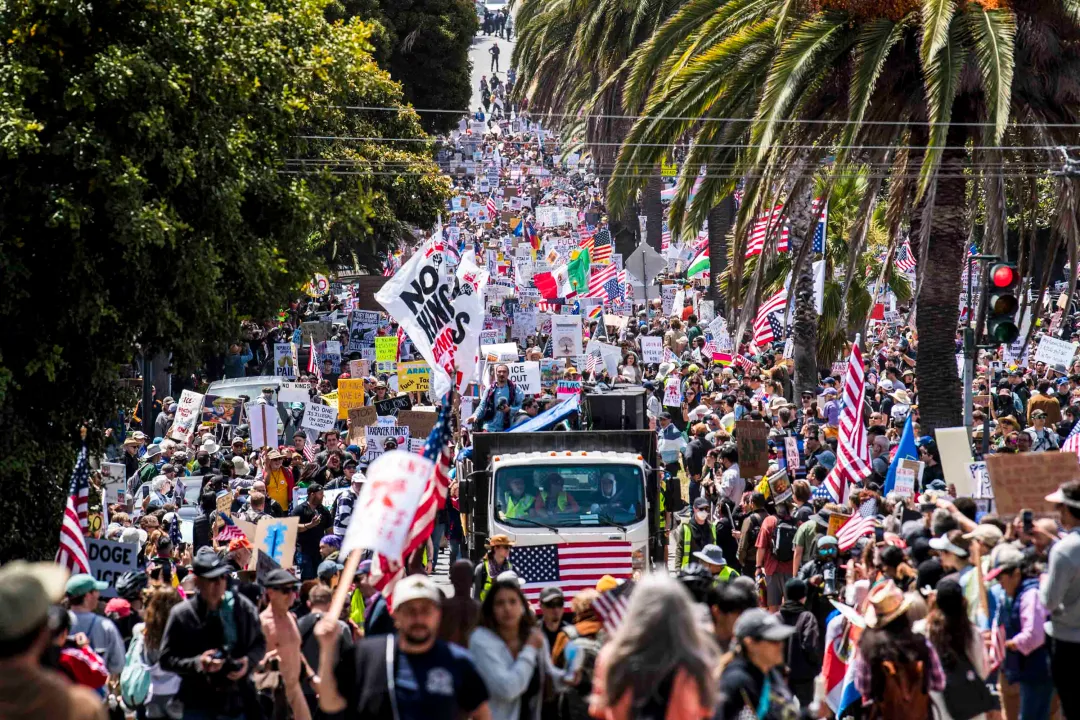 隨著聯邦執法部門的大規模部署,街頭回應也迅速升級。6月14日,洛杉磯與多座主要城市同步爆發大規模抗議,矛頭直指特朗普政府的強硬移民政策。據預估,全美有近五百萬人走上街頭響應週六的「No Kings」大遊行。主辦單位表示,僅費城一地就湧入超過十萬名參與者,芝加哥至少有七萬五千人加入行列,甚至在密歇根州僅有八百名居民的彭特蘭小鎮,也有近半數居民走出家門,高舉標語、走上街頭,抗議總統的強硬政策。