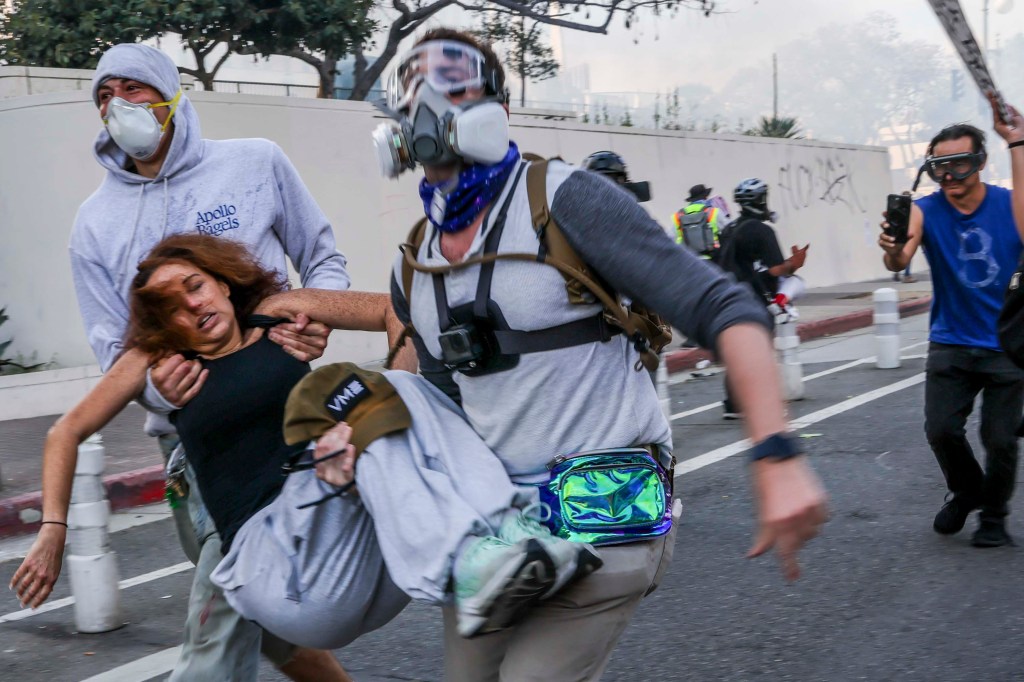 根據洛杉磯當地媒體LA TACO報導,警方出動騎警率先衝入仍在高呼口號的隊伍中,現場陷入混亂,多人受傷。一名手無寸鐵的年長者遭警馬踩踏,連連後退,隨後被警方推倒在地並遭警棍毆打。